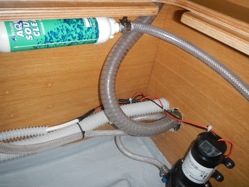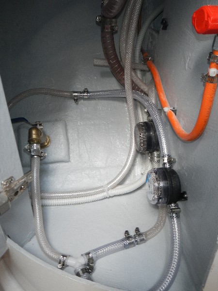 Wir entnehmen das Wasser direkt aus dem See und filtern es. Der Seewasserzugang für die Fusspumpe wurde daher mit einem "Y" aufgeteilt und die Pumpen mit Rückschlagventilen geschützt. Nach dem Wasserfilter geht es nun auf die Fusspumpe bzw. auf die Druckwasserpumpe. Hinter der Druckwasserpumpe reinigt ein Aktivkohlefilter das Wasser und verteilt es auf die zwei Entnahmestellen in Küche und Bad. Der Wasserfilter sollte jährlich ersetzt werden, ist jedoch sehr preiswert.